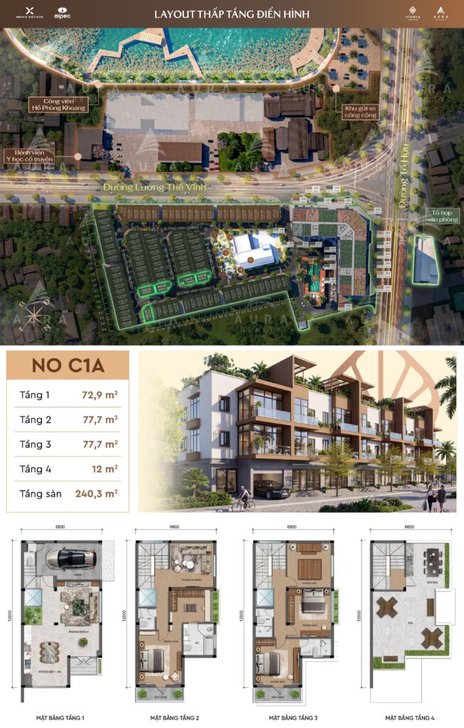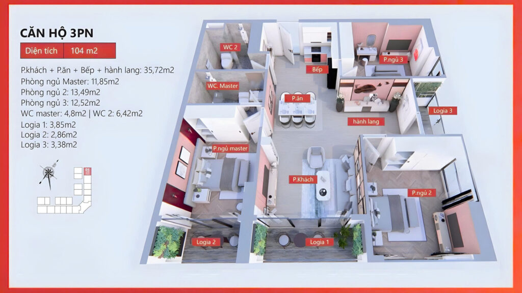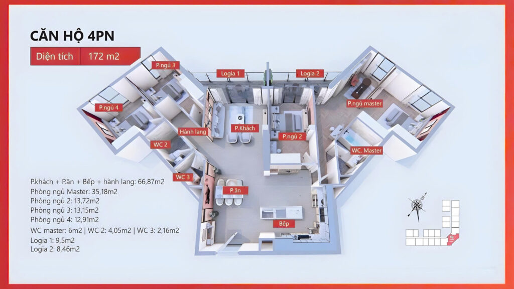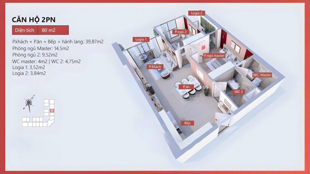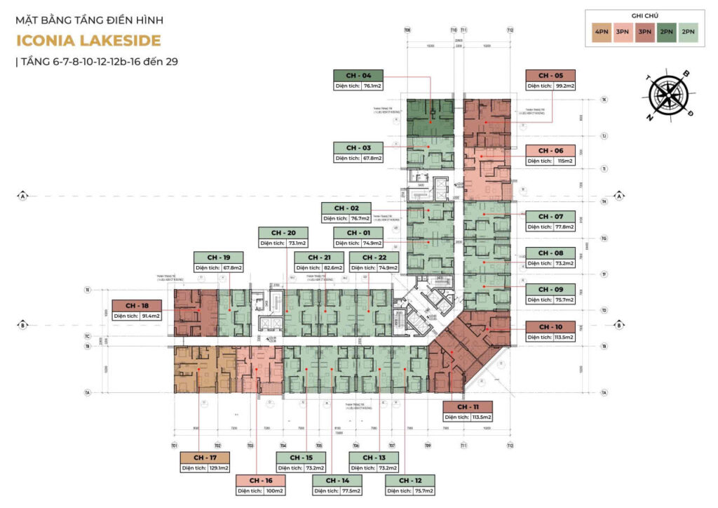 - Có các loại diện tích phổ biến 75m2-84,76m2; Góc xẻ khe 82,72m2 – 116,64m2